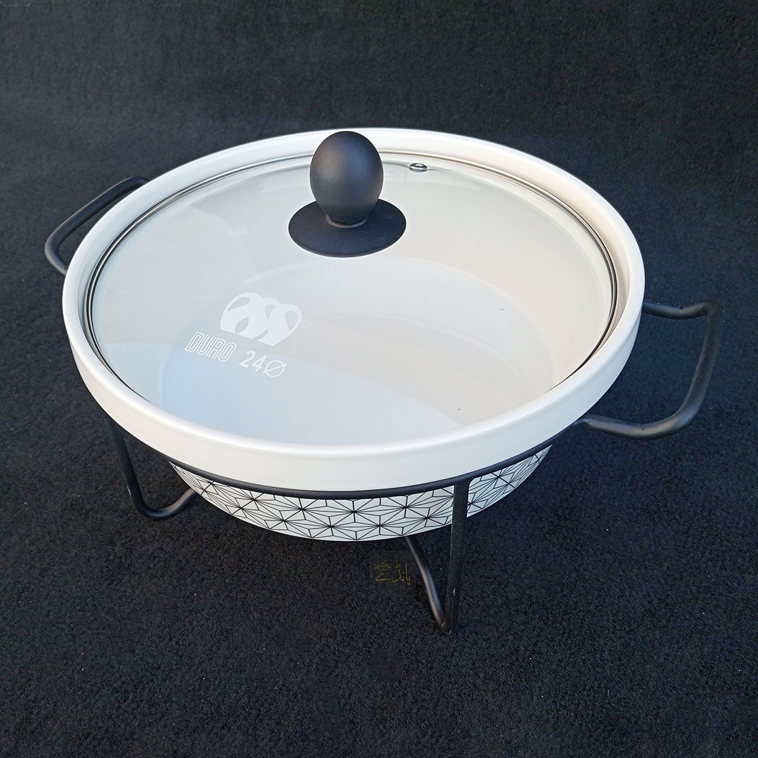 Upgrade your dining experience with this premium ceramic serving pot. Featuring a durable ceramic bowl with a stylish geometric pattern, this pot is perfect for serving rice, curries, soups, and stews. The transparent glass lid keeps food fresh and warm while allowing easy visibility. Its sturdy steel stand not only adds elegance but also provides stability for safe and convenient serving. Ideal for family dinners, parties, and festive occasions, this ceramic serving pot combines modern design with lasting functionality.