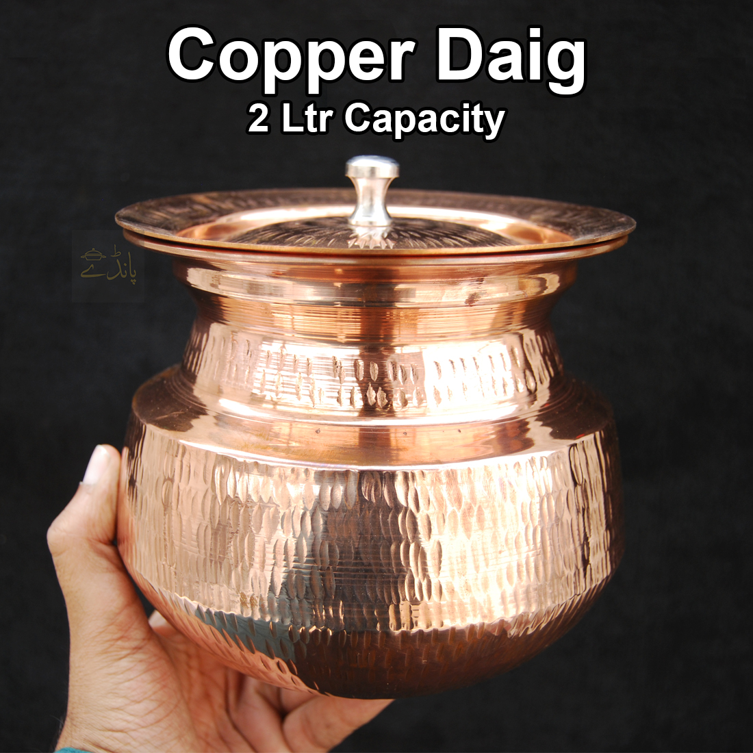 Serve your meals in timeless traditional style with this Pure Copper Daig (2 Liter Capacity). Handcrafted from 100% pure copper with a beautifully hammered finish, this daig is perfect for serving curries, rice, lentils, and festive dishes. The sturdy build and fitted lid help retain warmth while adding an elegant, royal touch to your dining table. Ideal for everyday use as well as special occasions, this copper daig blends heritage craftsmanship with practical functionality.
